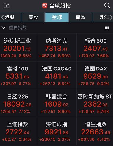 至少,截至发稿,美股并未让人失望,其中,道指暴涨约8%,一举收复20000点,纳指则大涨6%,标普500指数上涨7%。