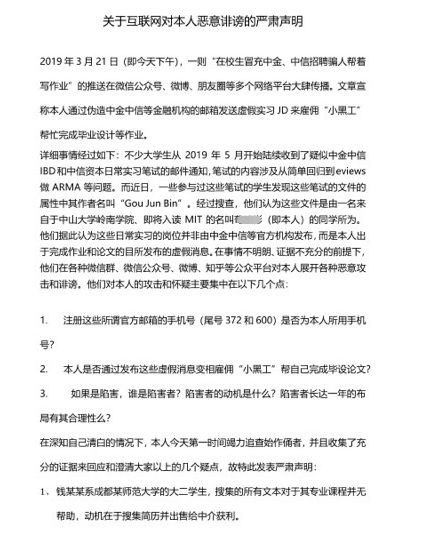 此后,当事人发布公开声明进行澄清,称系他校某大二学生所为,动机在于收集简历并出售给中介机构获利,并晒出大量证据。不过,相关内容再次引起网友们的大量围观质疑。涉及券商也表示:相关实习招聘信息为假。最终,该次闹剧以当事人自行承认并道歉收尾。