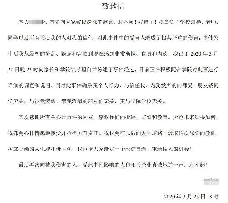 在引起大量围观爆料之后,当事人也出面发布公开声明进行澄清,称系其相识的某校大二学生钱某某所为,并晒出大量证据。