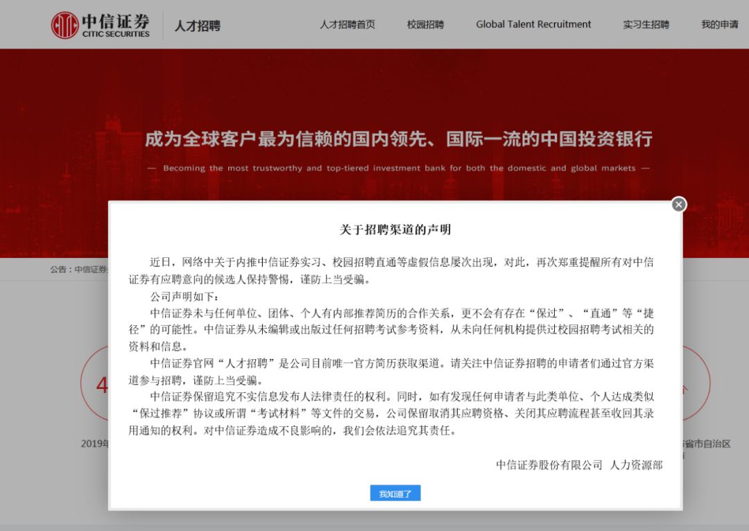 登陆中信证券官网,其人才招聘板块会首先跳出《关于招聘渠道的声明》。中信证券表示,近日网络中关于内推中信证券实习、校园招聘直通等虚假信息屡次出现。对此,再次郑重提醒所有对中信证券有应聘意向的候选人保持警惕,谨防上当受骗。