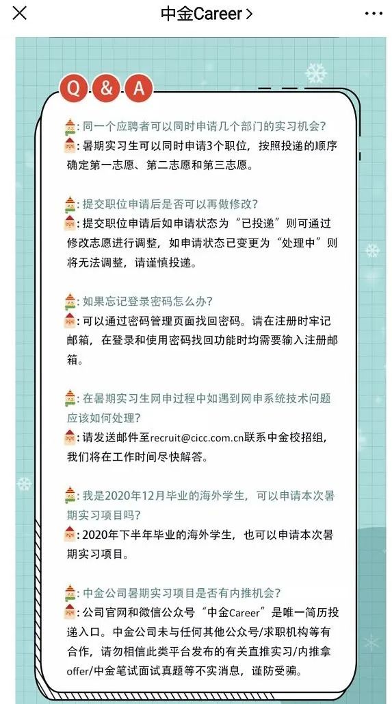 在中金公司发布的2020年暑假实习生项目启动说明中,也特意提到,中金官网和微信公众号是唯一简历投递入口,中金公司未与任何其他公众号/求职机构等有合作,相关平台发布的有关直推实习/内推拿offer等信息均为不实信息。