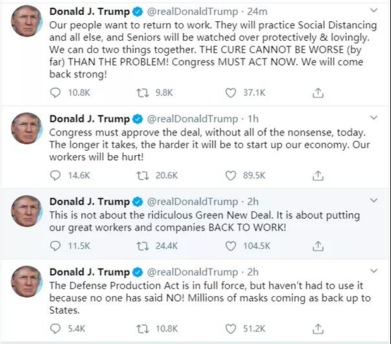 特朗普当地时间24日连发四推, “今天,国会必须在没有任何废话的情况下批准该协议。时间越长,我们的经济就越困难。我们的工人会受伤!”