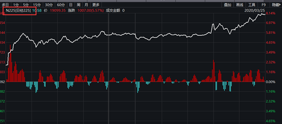 行情数据显示,日经225指数收盘上涨接近1500点,涨8.04%,报19546.63点,创2008年11月来最大升幅。短短两个交易日时间,日经指数上涨接近2700点。