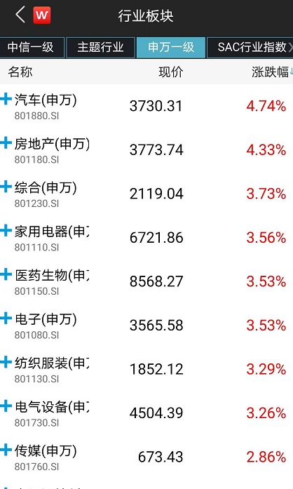 汽车板块大幅上涨。房地产、综合、家用电器板块活跃。