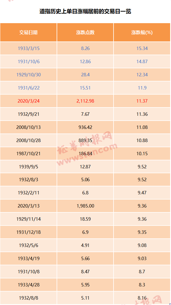 数据显示,美股道琼斯工业指数历史上单日涨幅超过2020年3月24日的只有4次,全部是在1929年到1933年之间,这段时间正好是美国历史上有名的大萧条时期,此后波及欧洲、日本等主要经济体,成为世界性经济危机。