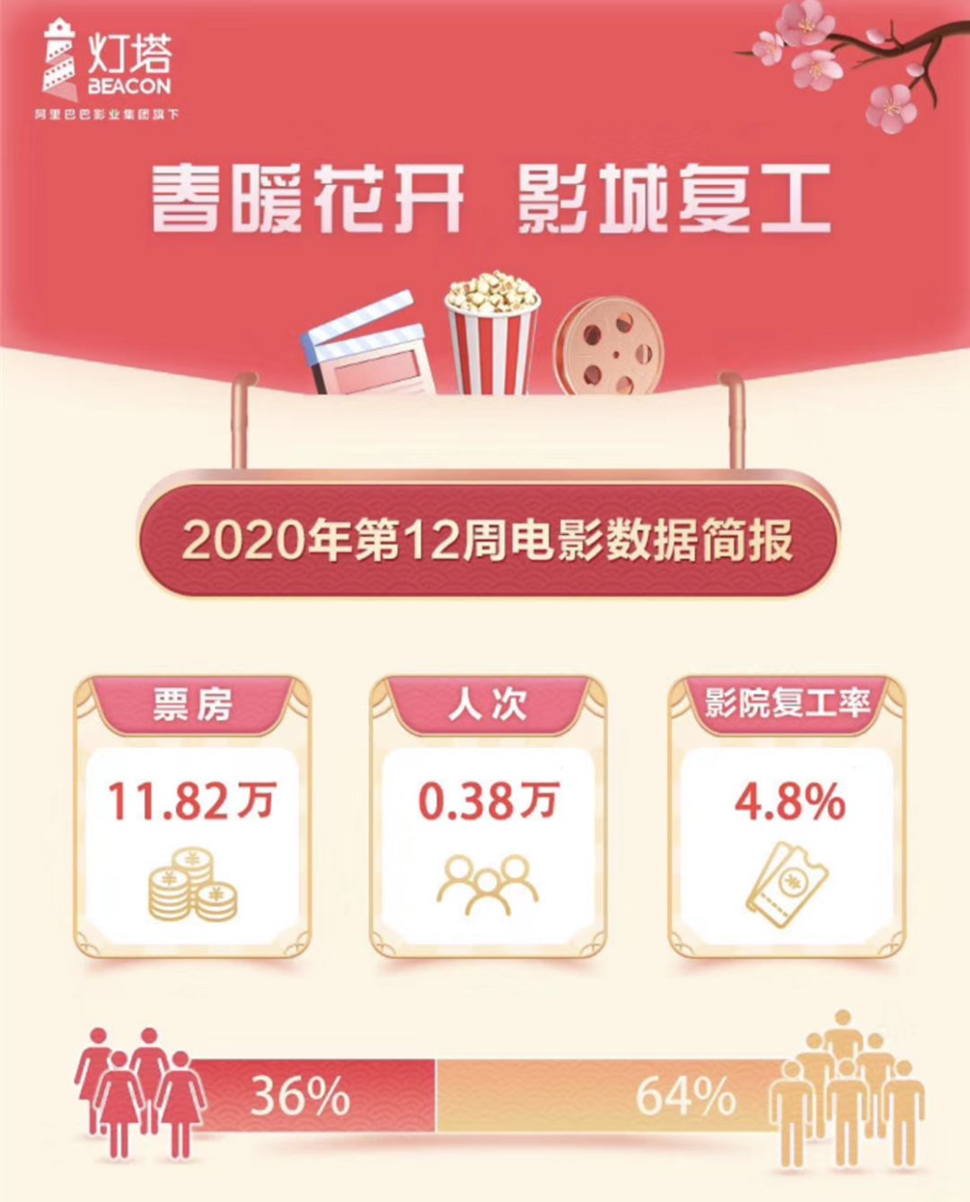 从上周开始,停摆近两个月的电影院陆续打开大门,灯塔专业版数据显示,2020年第12周(3月16日至3月22日),全国影院的整体复工率为4.8%。其中,河南地区和新疆地区复工率相对较高,分别为25.8%和23.1%。