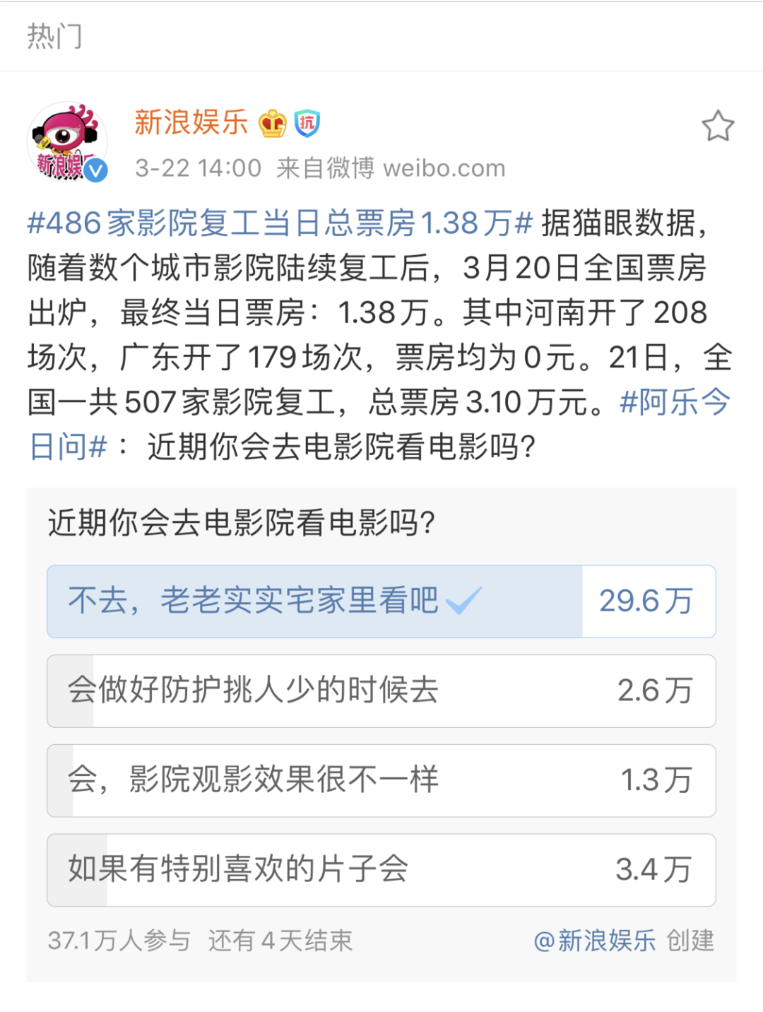 近日,为了了解消费者的观影意愿,新浪电影发起了一项投票,截至3月25日,共吸引37.1万人次参与。结果显示,在上述37万人中,有29.6万人选择“不去,老老实实宅家里看”,占比高达80%;另有3.4万人次表示“如果有特别喜欢的片子会去看”。