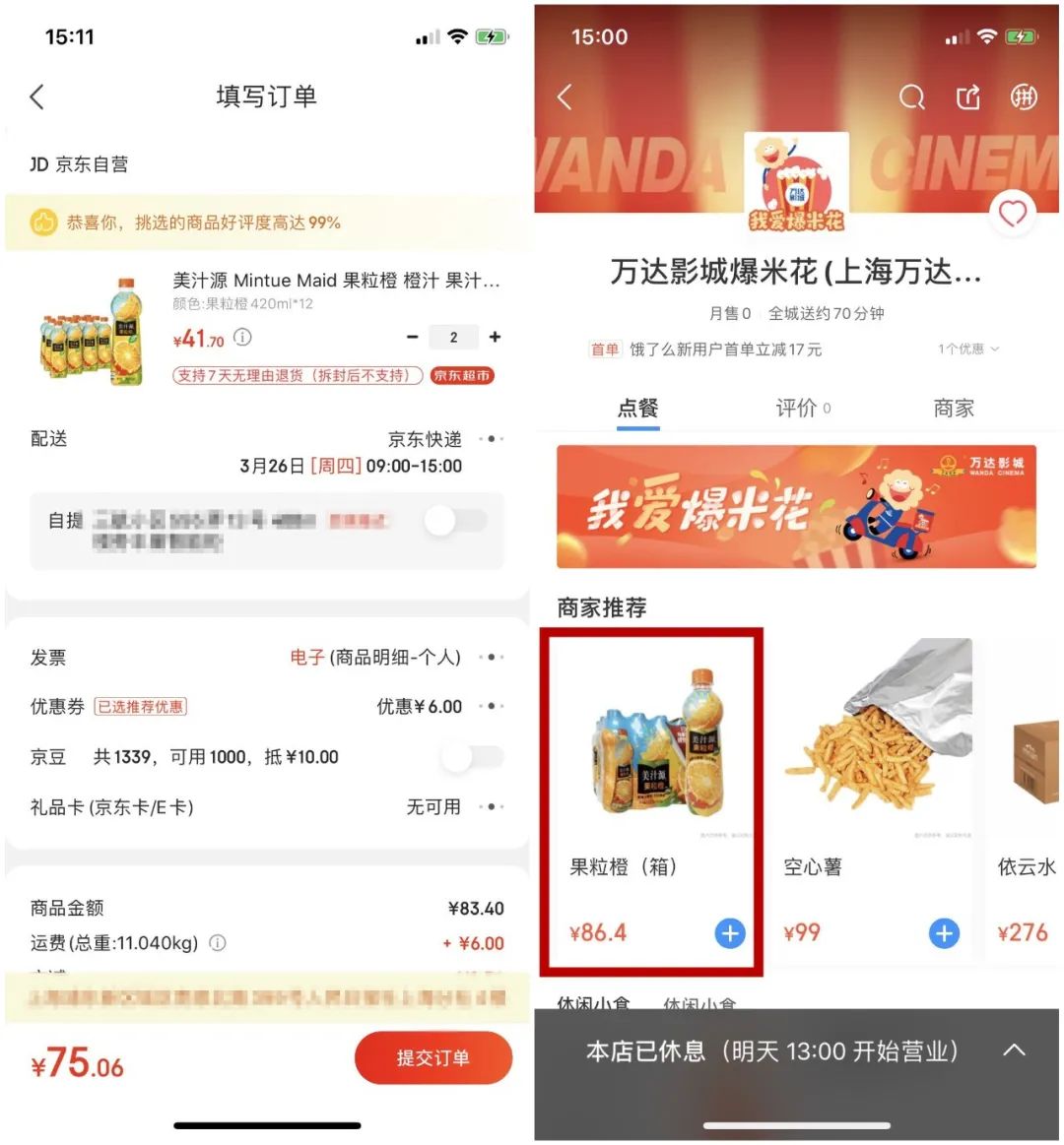 记者注意到,上述渠道商所言不假。以万达影城爆米花(上海万达影城成山店)为例,其24瓶装的果汁源售价为86.4元,而京东超市中同规格12瓶装的促销前售价为43.9元,购买两件的促销价为75.06元,低于影城的售价。