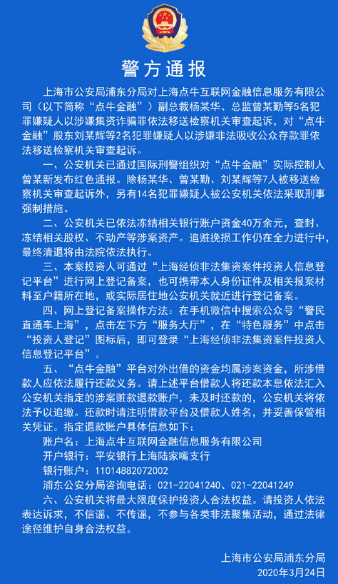 3月24日,上海警方通报,已通过国际刑警组织对点牛金融实际控制人曾某新发布红色通报,另有14名犯罪嫌疑人被公安机关依法采取刑事强制措施,7人被移送检察机关审查起诉。