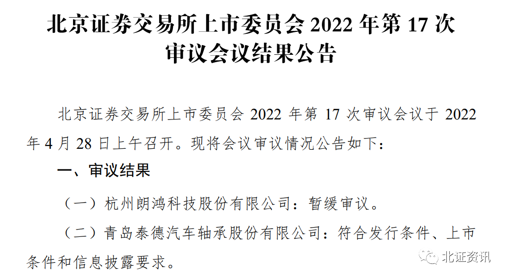 在4月28日召开的北交所2022年第17次审议会议上,上会的两家企业结果分化:国家级专精特新“小巨人”泰德股份顺利过会,背靠华为、小米等明星客户的朗鸿科技,却因境外销售、研发费用、募投项目等需补充披露而暂缓审议,成为北交所第3家暂缓审议的企业。