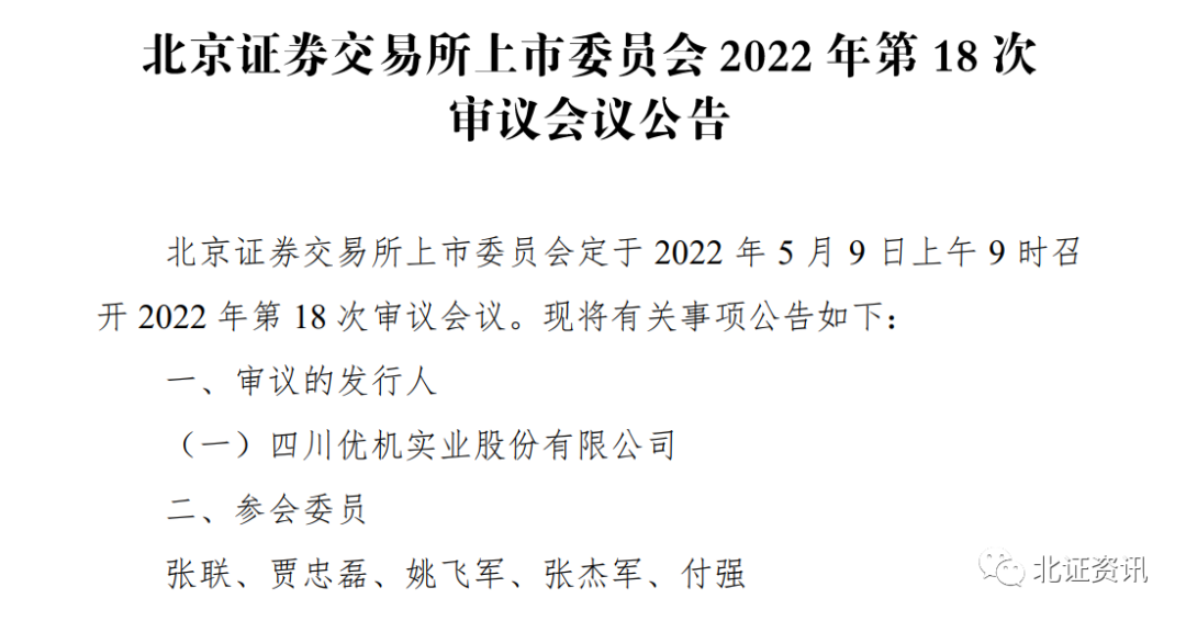 根据北交所网站披露,2022年第18次审议会议已定于5月9日举行,届时将有优机股份上会。