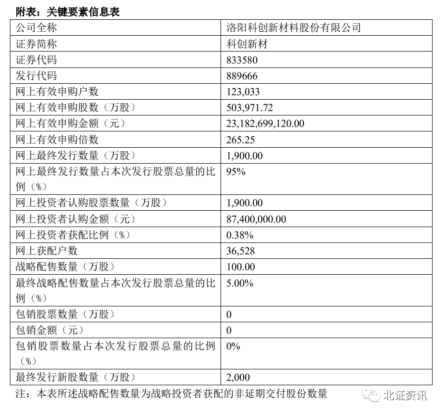 另一方面,今天科创新材公布发行结果:本次网上发行获配户数为36,528户,网上获配股数为1,900.00万股,网上获配金额为 8,740.00 万元,网上获配比例为0.38%。
