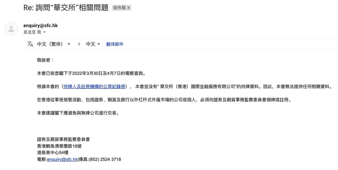 为了进一步求证华交所的性质,记者以投资人身份通过电邮联系了香港证监会,询问是否知晓这家公司。