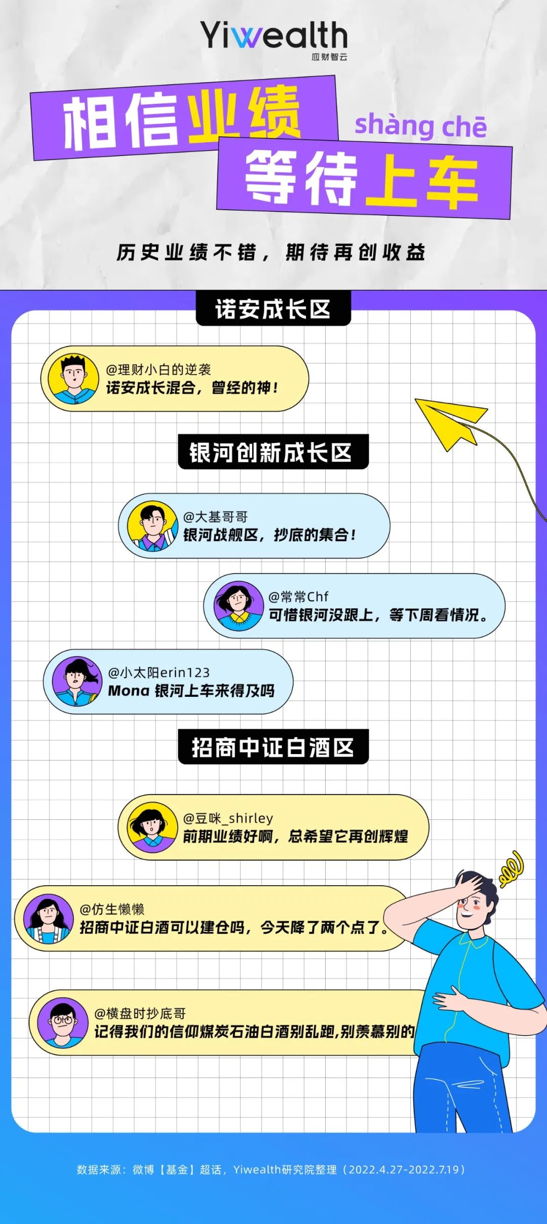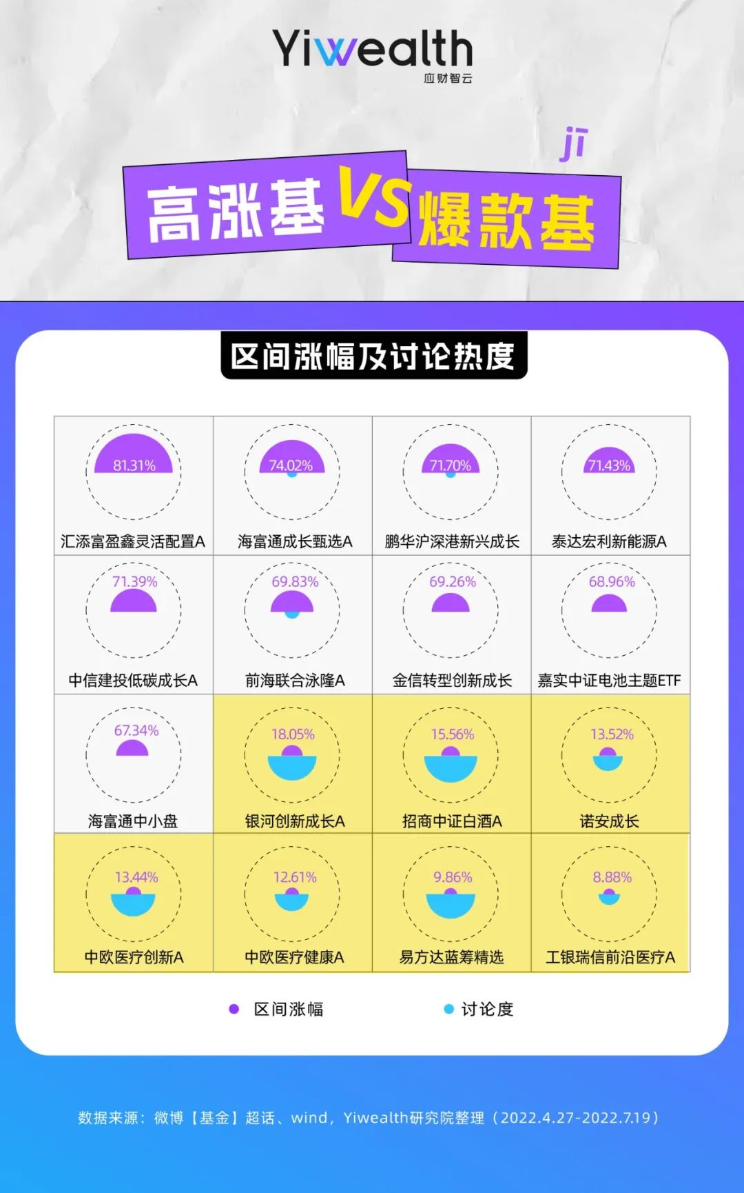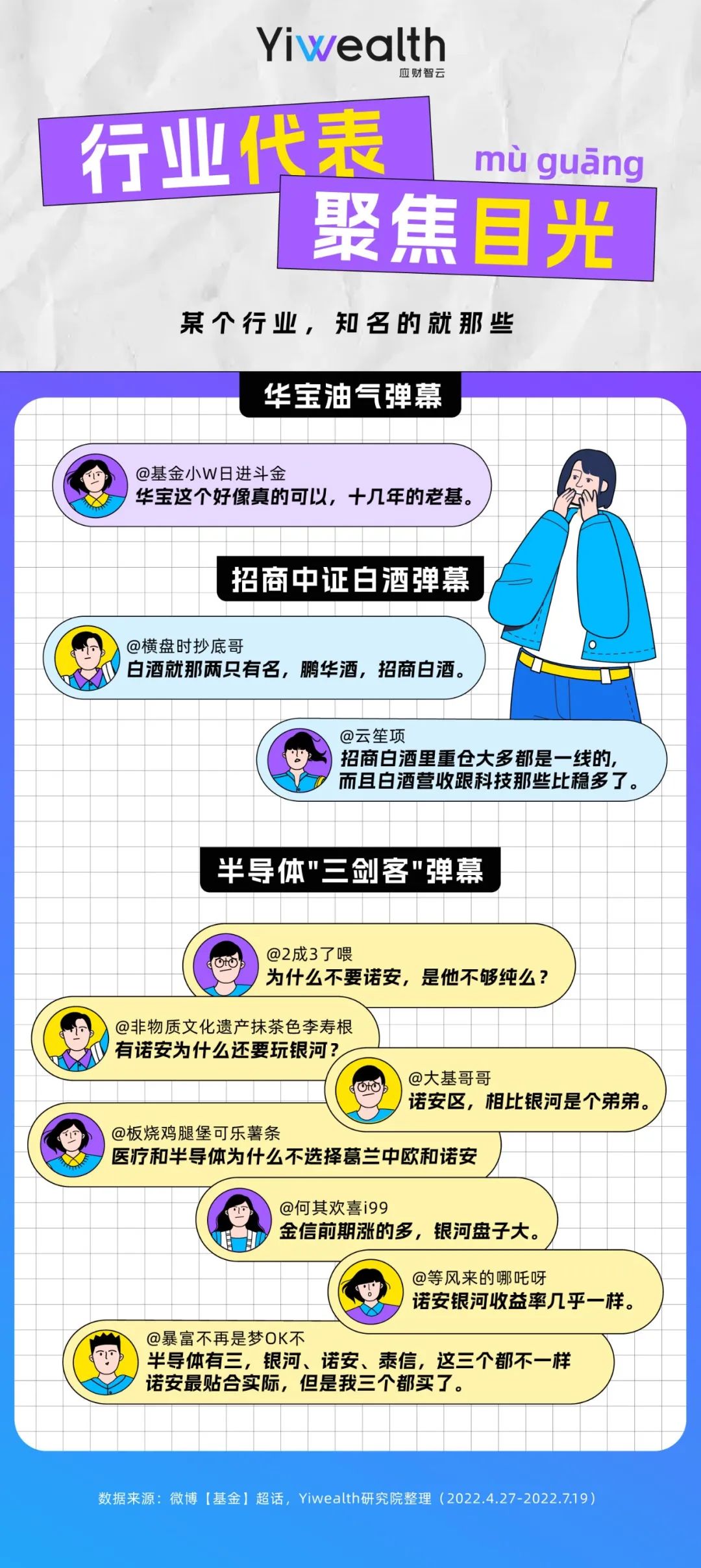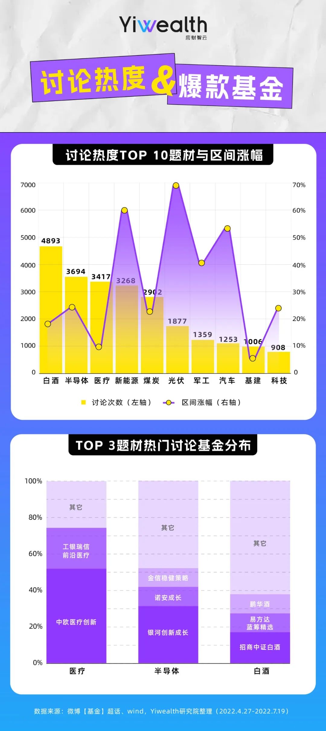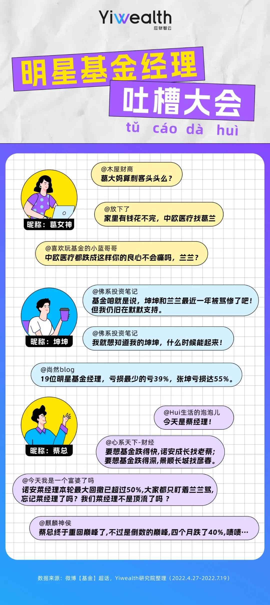 如今,离公募基金“出圈”已过2年,市场也在二、三季度先后迎来反弹和回调,经历起伏的基民们如何度过这“拉扯”时刻?为倾听他们的声音,Yiwealth研究院选择了百万基民扎堆的微博【基金】超话社区进行研究。在对4月27日-7月19日这一股市反弹区间发布的19071条主贴、87359条跟帖分析后,我们发现了一些值得思考的现象。