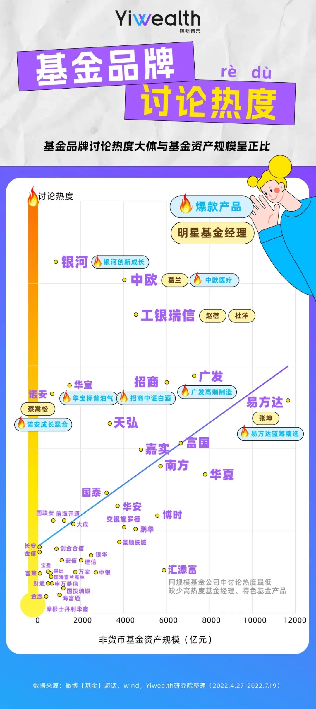 Yiwealth研究院统计了微博讨论热度较高的基金品牌,并与基金公司非货基金管理规模对比后发现: