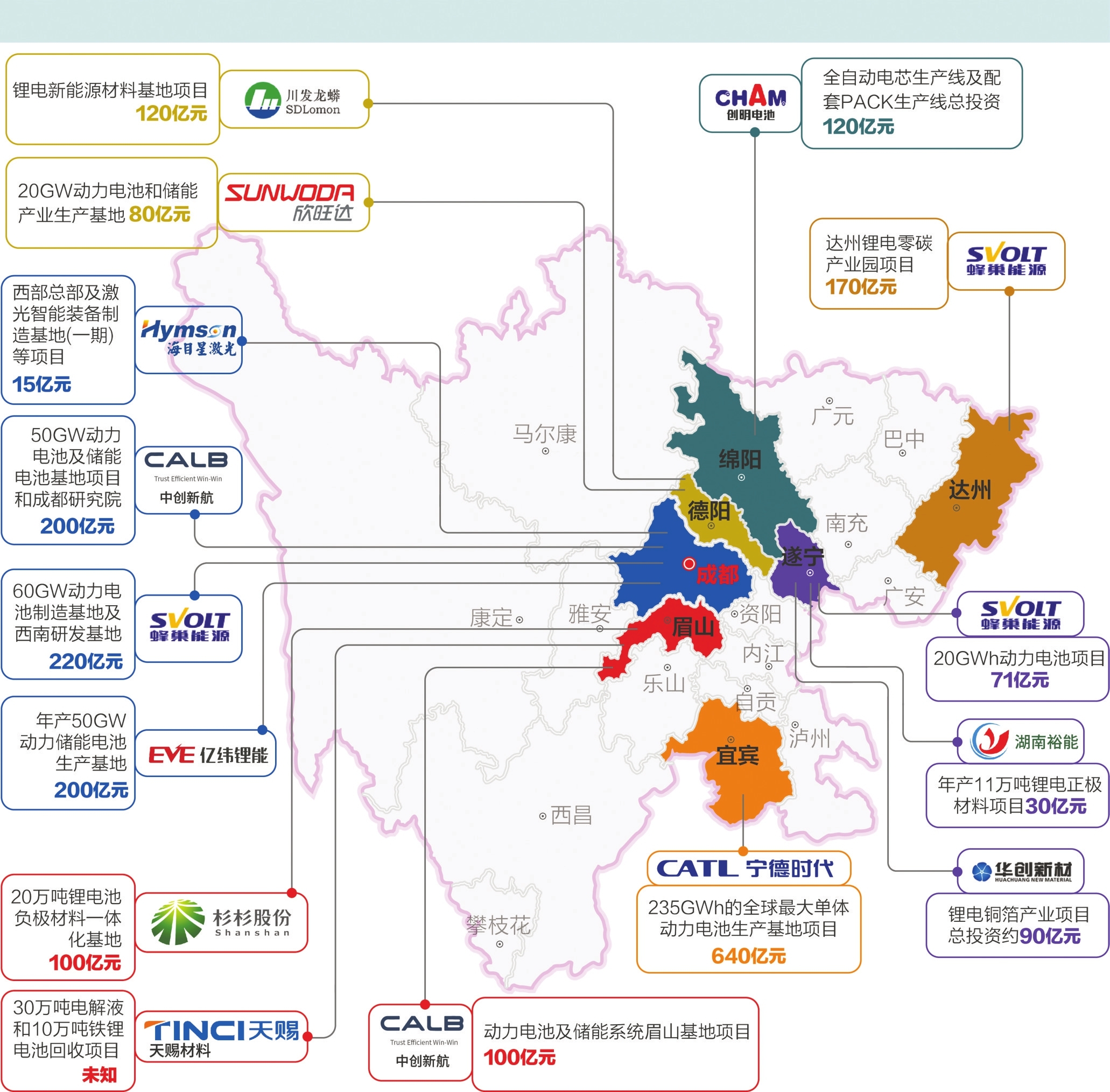 其中,坐拥两大锂矿和巨量清洁能源的四川成为锂电巨头们优先布局的新高地。多个市州动作频频,迅速聚集起宁德时代、比亚迪等行业龙头,以及亿纬锂能、中创新航、贝特瑞、大族激光等细分领域领军企业。